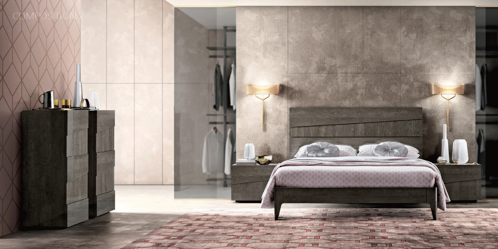 Комплет спална соба Текно, кревет 200х160см, две наткасни и комода. Можност за избор и на други комбинации во зависност од просторот, и можност за дополнително вградување на ЛЕД осветлување.