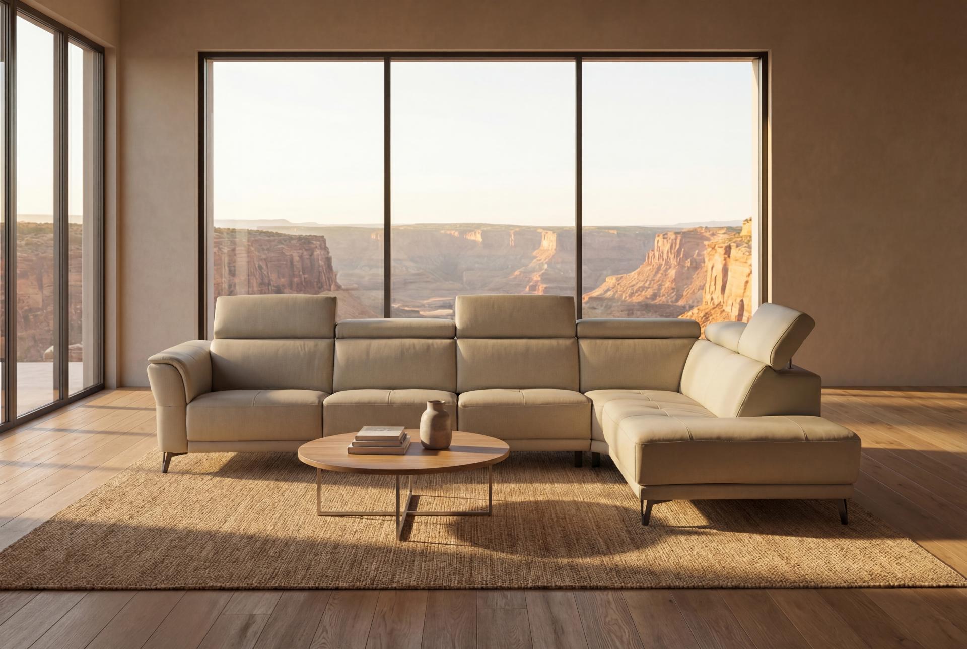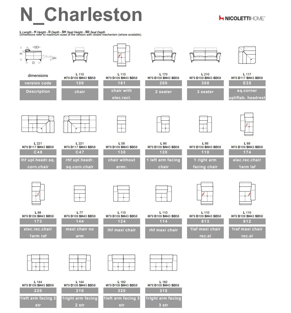 Аголна гарнитура Чарлстон. Можност за избор и на други димензии и комбинации во зависност од просторот и можност за дополнително вградување на електричен релакс механизам.